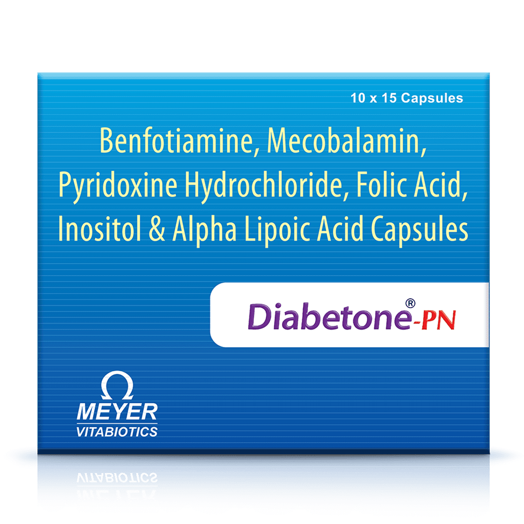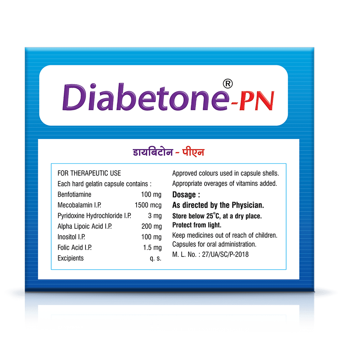 Diabetone PN Capsules are specially formulated to prevent and treat peripheral neuropathy. Packed with key ingredients, including Benfotiamine, Methylcobalamin, Folic Acid, Vitamin B6, Inositol, and Alpha Lipoic Acid, this comprehensive blend offers multiple benefits for nerve health.