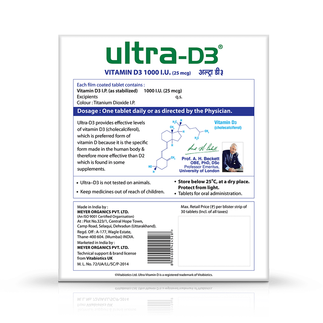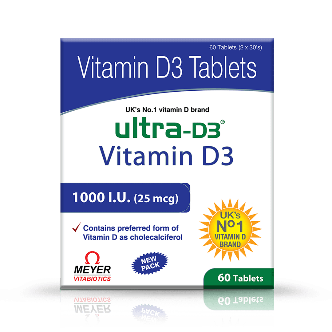 Ultra D3 1000IU tablets contribute to maintaining normal bones & teeth health while supporting the immune system, cell division and muscle function. These tablets are effective in preventing bone disorders like osteopenia, osteoarthritis.
