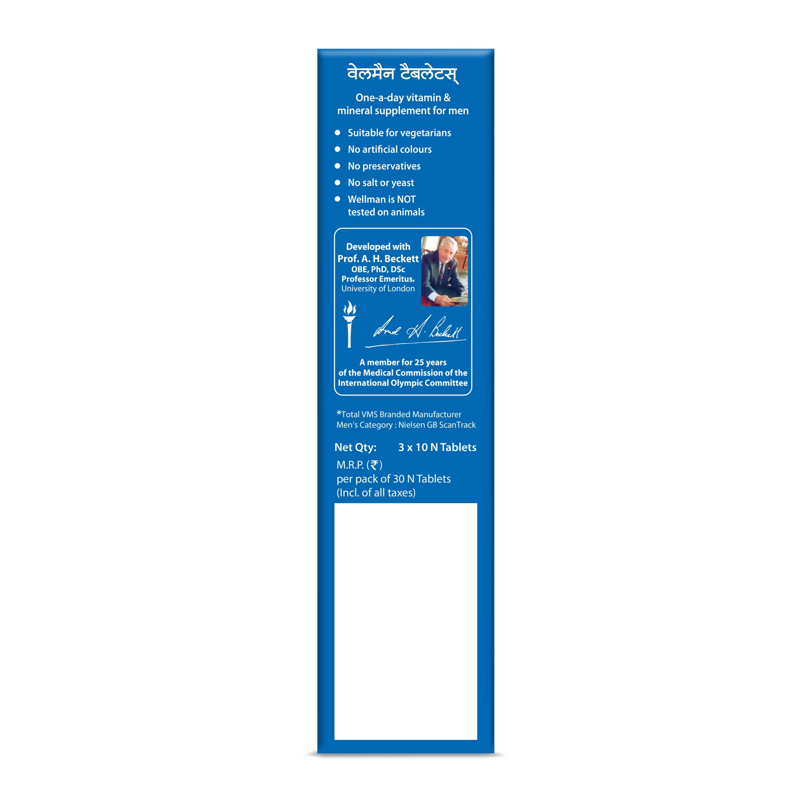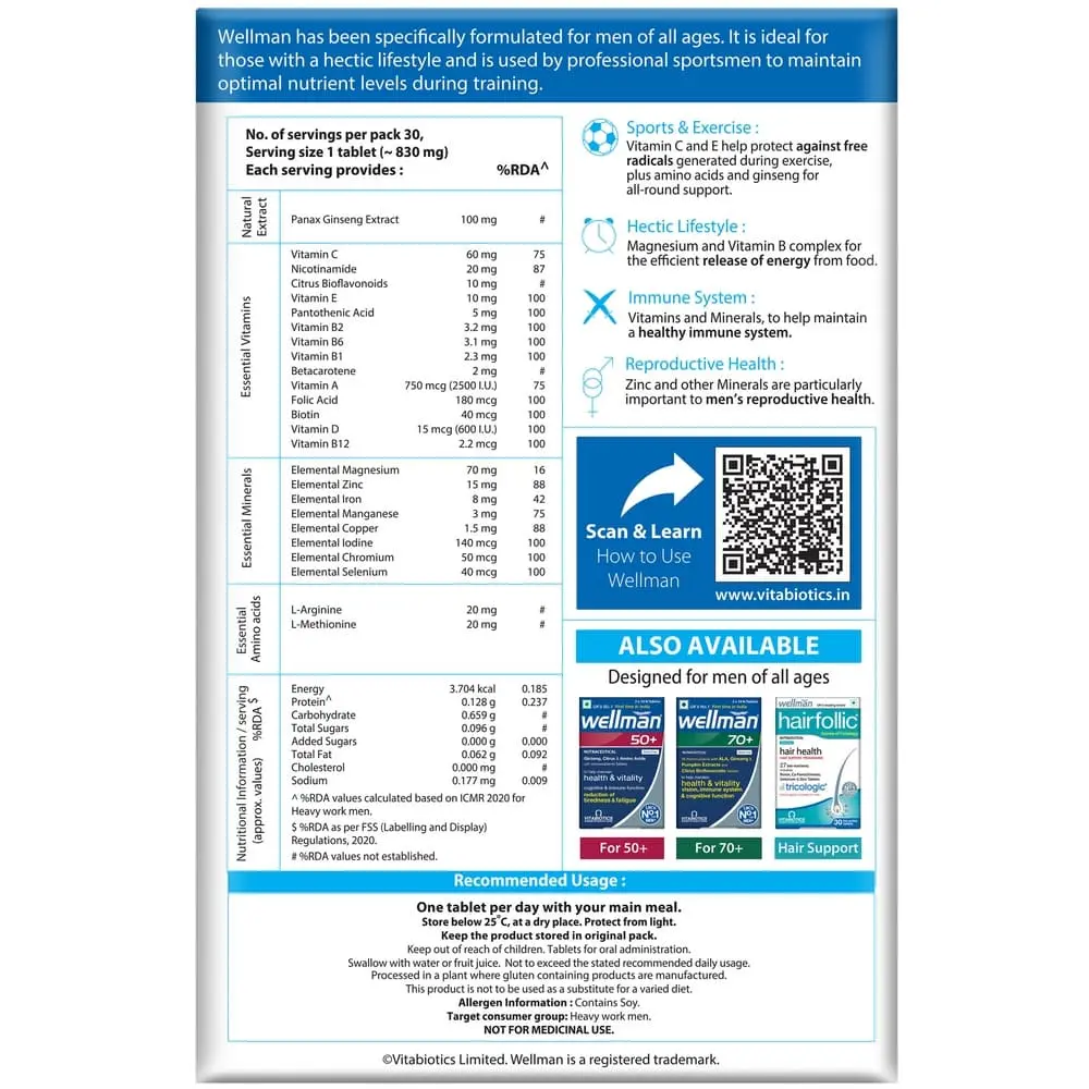 Wellman is our flagship multivitamin with 21 essential vitamins and minerals specially developed for men to help maintain overall health and vitality. Also it includes Ginseng and amino acids like L-Arginine that boosts energy release and reduces fatigue.