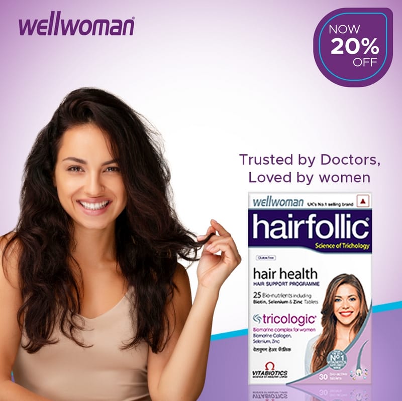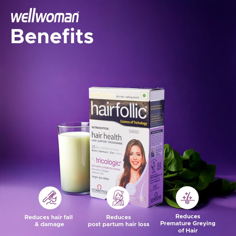 Wellwoman Hairfollic hair supplements for women are a unique blend of 25 essential nutrients, like biotin, selenium, and zinc, that help keep hair healthy and reduce the hair damage.
